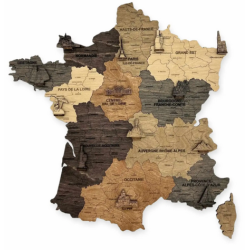 La carte de la France en bois 2D Graphite est une représentation de la carte géographique de la France fabriquée en bois avec des couleurs multiples.